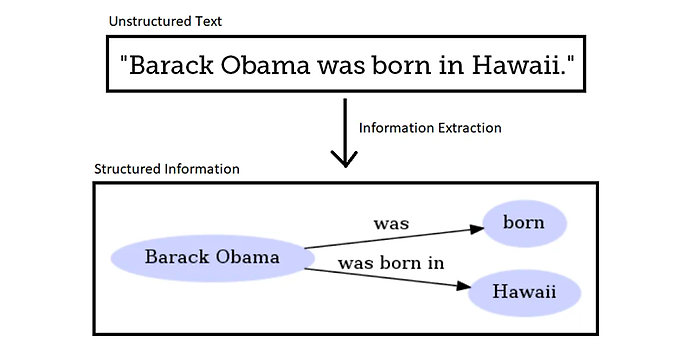 Im folgenden Beispiel für Informationsextraktion werden unstrukturierte Textdaten in einen strukturierten semantischen Graphen umgewandelt. Ein allgemeines Ziel der Informationsextraktion ist es, Wissen aus unstrukturierten Daten zu extrahieren und dieses Wissen für verschiedene andere Aufgaben zu nutzen.