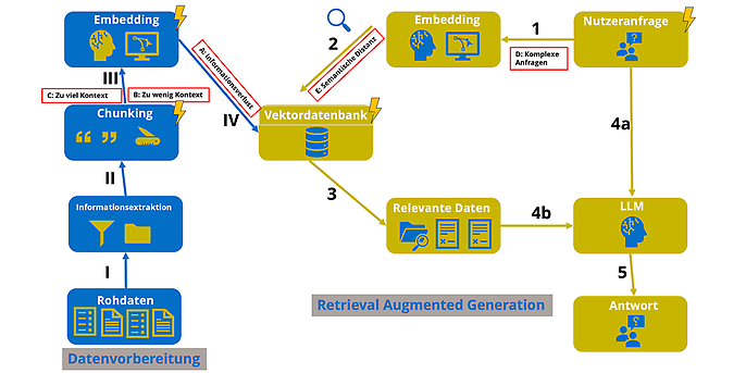 Mit der Einführung von ChatGPT und Co. ist der Siegeszug der Large Language Models (LLM) in vielen Bereichen kaum noch aufzuhalten. Neben den kreativen Einsatzmöglichkeiten, wie zum Beispiel der Textgenerierung, ist vor allem die Möglichkeit, Fragen an eigene domänenspezifische Daten und Dokumente zu stellen, von großem Interesse in Industrie und öffentlicher Verwaltung. Ein methodisches Framework, das genau diesen Anwendungsfall ermöglicht, ist die sogenannte Retrieval Augmented Generation (RAG, siehe Blogbeitrag „Retrieval Augmented Generation: LLM auf Steroiden“). Trotz der vielfältigen Einsatzmöglichkeiten von RAG gibt es typische Probleme, deren Lösungsansätze im folgenden Artikel vorgestellt werden sollen.