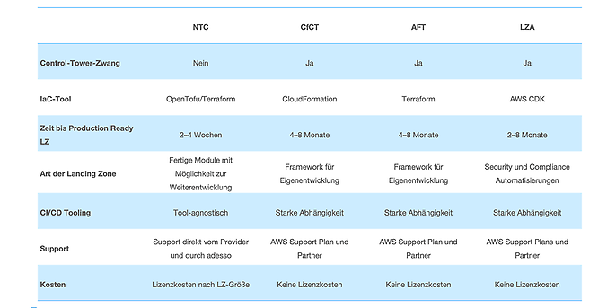 - Der Landing Zone Accelerator (LZA) stellt ebenfalls in kürzester Zeit eine umfassende Landing‑Zone‑Umgebung bereit.