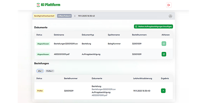 - Multiupload: Bisher konnten immer nur die Dokumente einer einzigen Bestellung hochgeladen werden. Im MVP ist es möglich, mehrere Bestellungen gleichzeitig zu verarbeiten. Dazu werden die Dokumente zunächst in den Cloud Storage hochgeladen. Im Firestore wird anschließend erfasst, zu welchen Bestellungen bereits Daten vorliegen, was fehlt und wie der Status des Vergleichs ist.