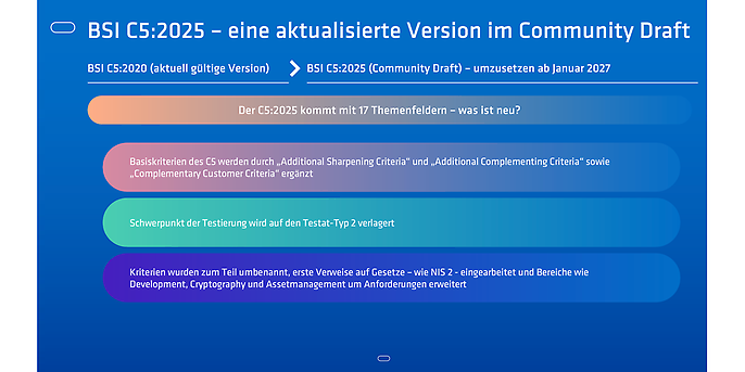 Neben dem §393 SGB V, welcher seit Juli 2025 ein BSI C5 Testat beim Bearbeiten von Gesundheits- und Sozialdaten in einer Cloud-Lösung vorsieht, hat das BSI einen „Community Draft“ des C5 in einer neuen Version veröffentlicht: „Cloud Computing Criteria Catalogue C5:2025“.