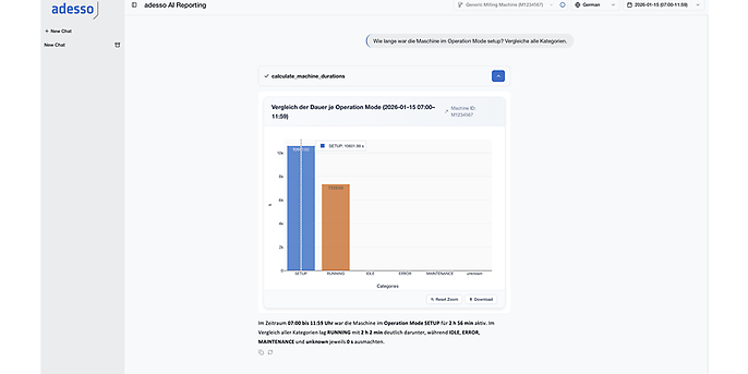 Szenario 1: Eine Technikerin fragt: „Wie lange war die Maschine im Operation Mode setup? Vergleiche alle Kategorien.“