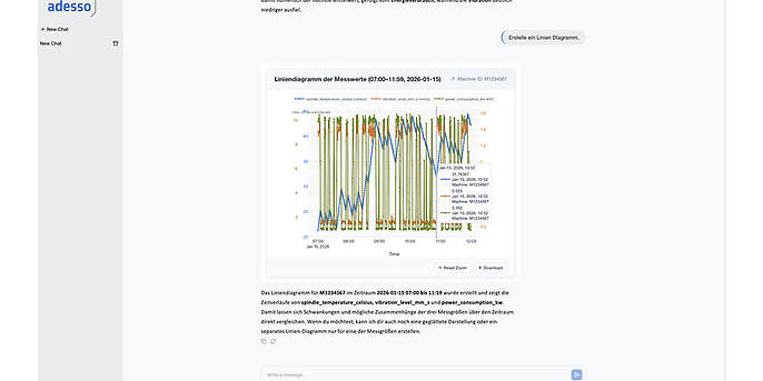 Ein Kernproblem herkömmlicher KI-Ansätze ist die Statik. Ein Bot liefert oft nur Text oder ein unbewegliches Bild. Genau hier setzt unser Showcase mit dynamischen interaktiven Diagrammen an. Unser Agenten-System liefert kein fertiges Bild, sondern ein interaktives Datenobjekt, welches im Frontend als Diagramm angezeigt wird. Durch diesen Ansatz eröffnen sich für User verschiedene Möglichkeiten: